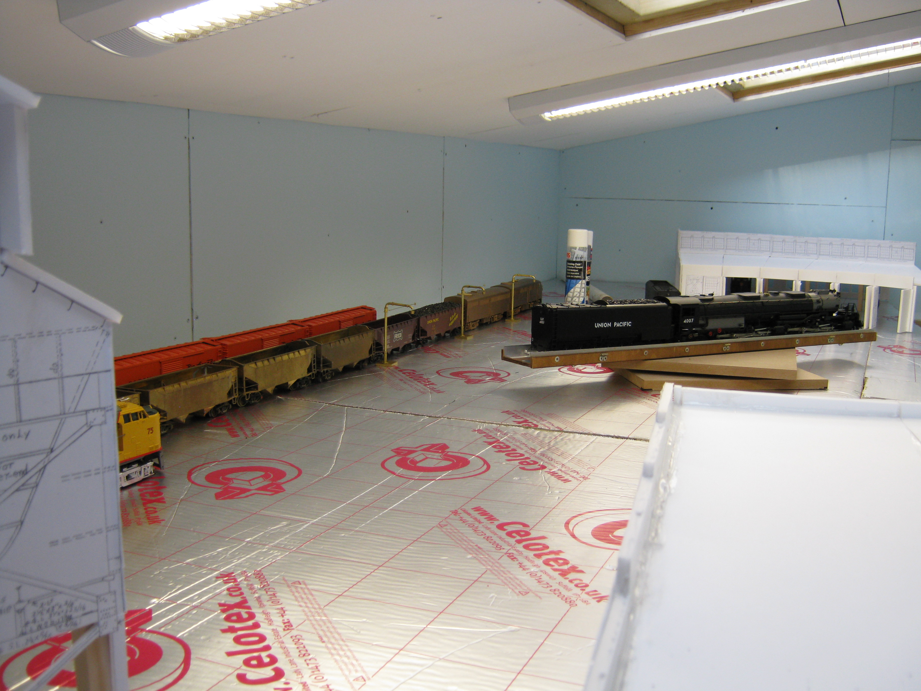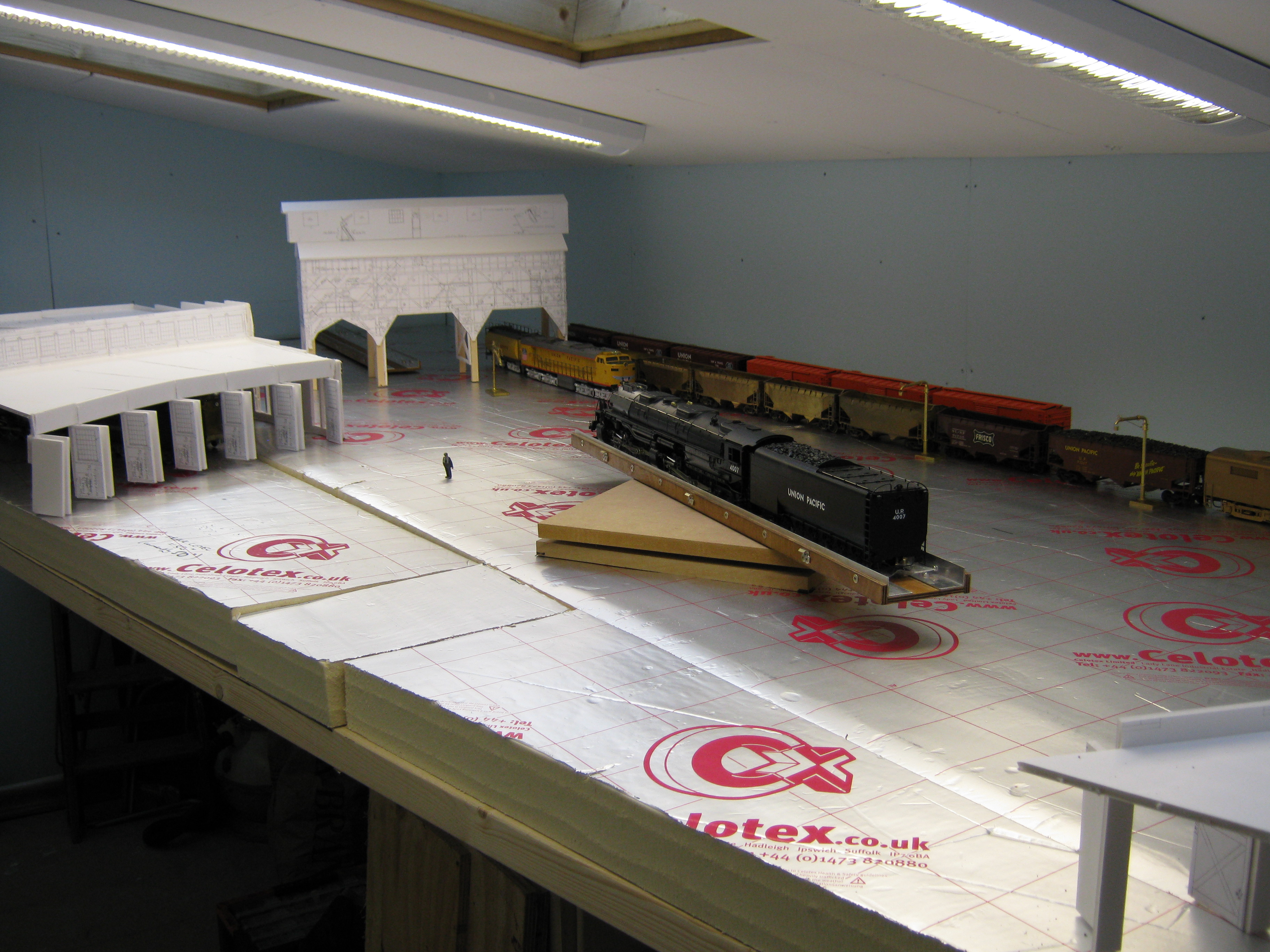 Celotex insulation sheeting was used as temporary baseboards (delaying the insulation of our roof space by a month or two!) and, since at this stage none of the buildings or the turntable had been built, they were mocked up using a ‘lazy susan’ ball race for the turntable and foamboard for the buildings.